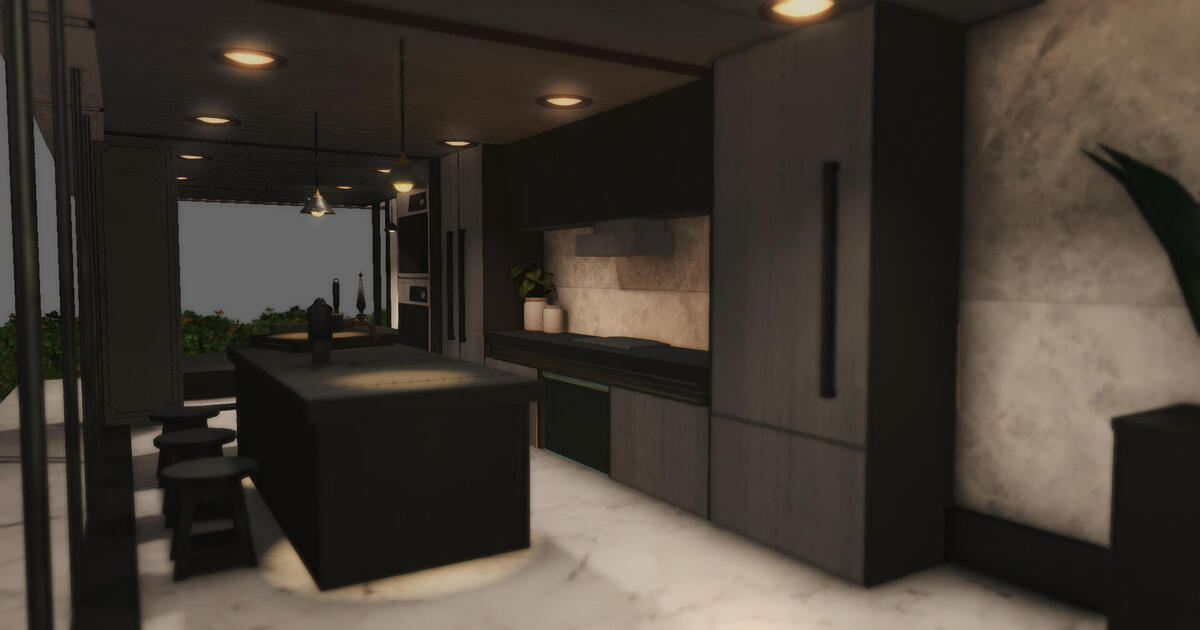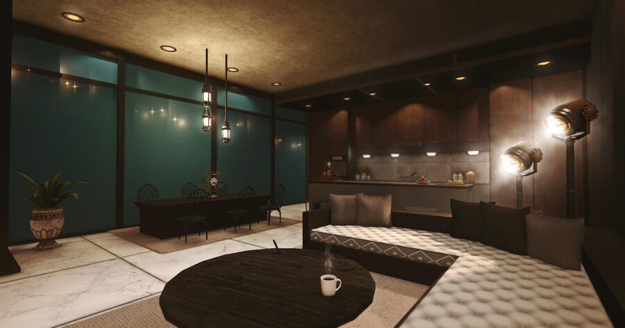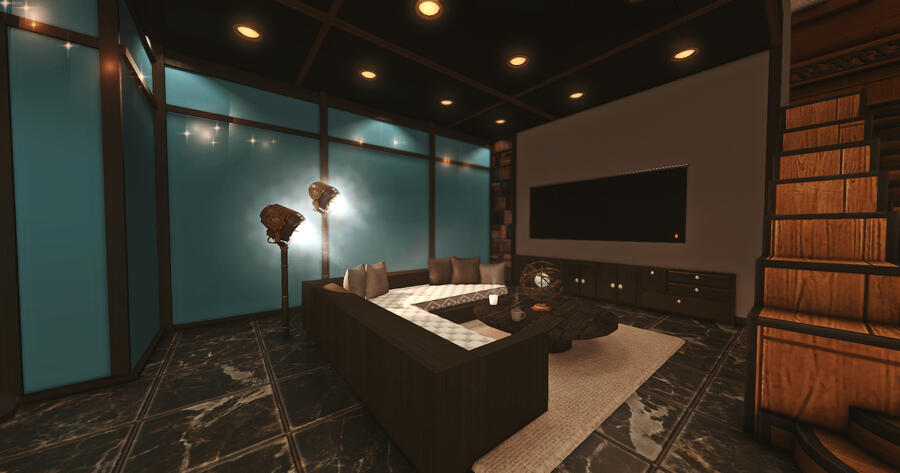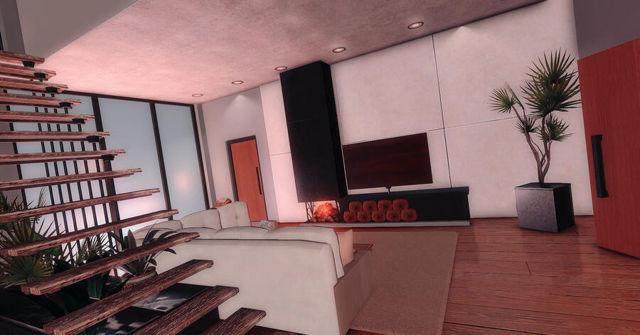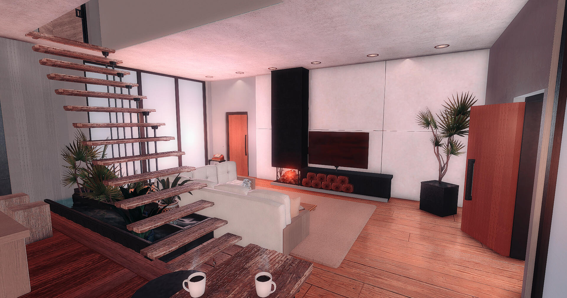 A modern sky rise apartment.Perfect living room/kitchen to host guests in with a moody bedroom and comfortable bathroom to enjoy. Also when will people realize I just name houses based on Gorillaz songs. There's so many.