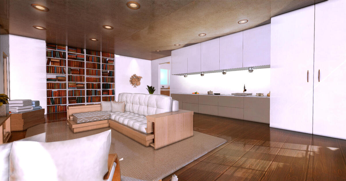 Out of bounds penthouse within the confines of a small house.Features an open concept kitchen, living room, and private pool.Includes a living room area, kitchen, and pool.