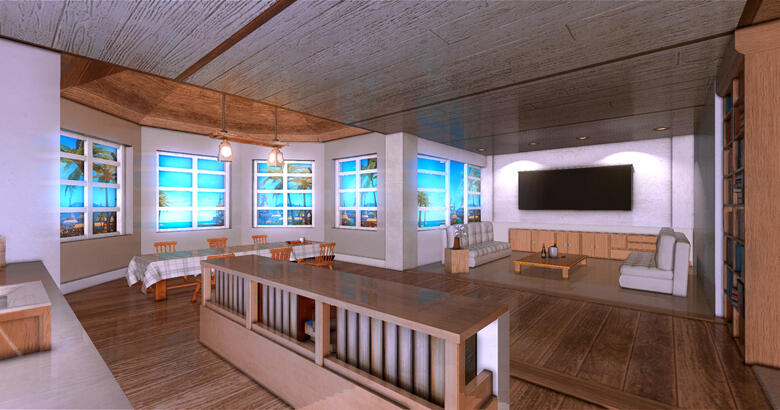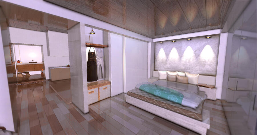 A hideaway home on the beach. Featuring a bedroom, kitchen, and living room. Additional bathroom is accessible in the (M) design.