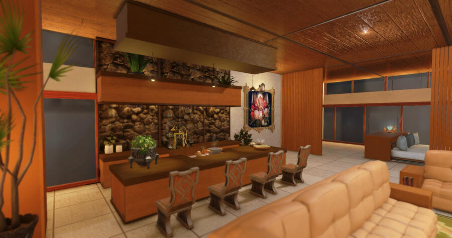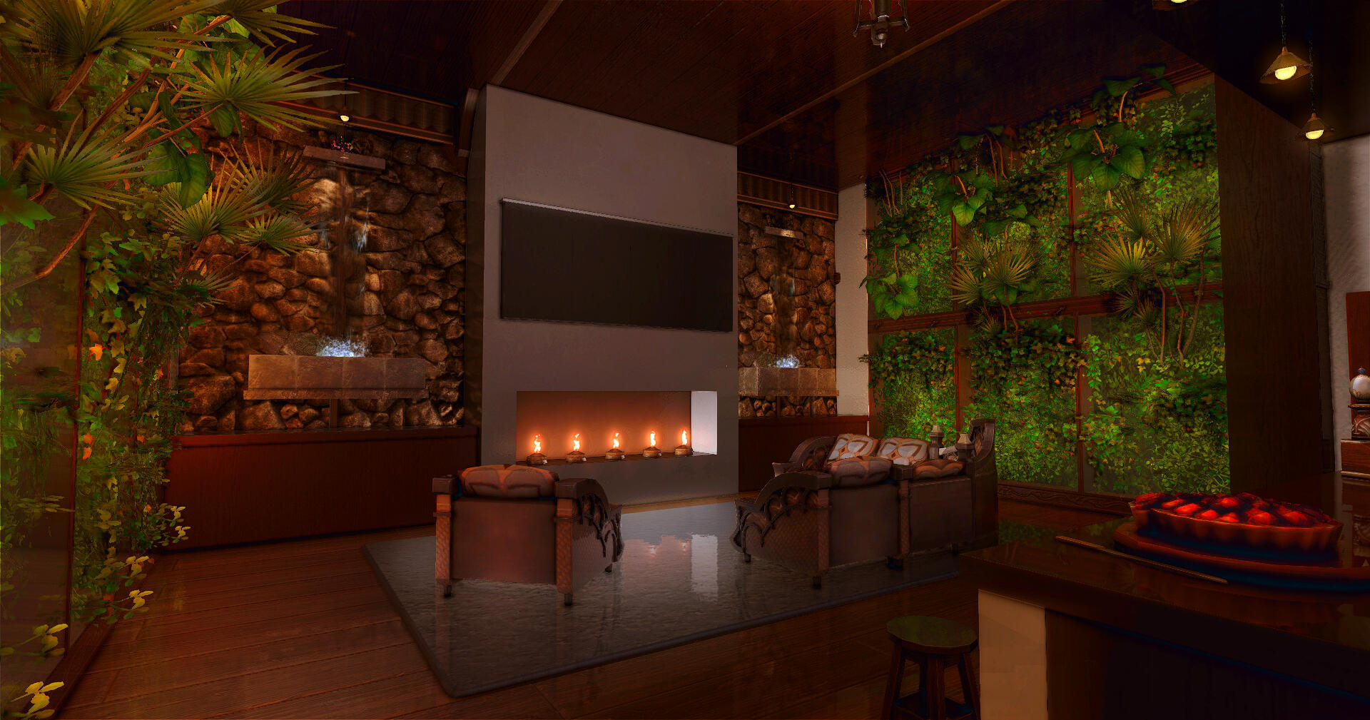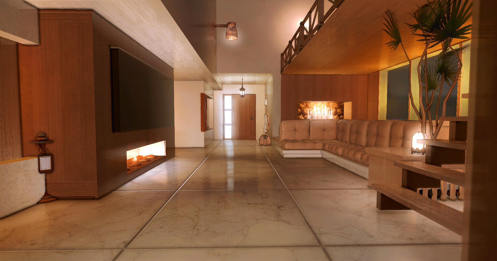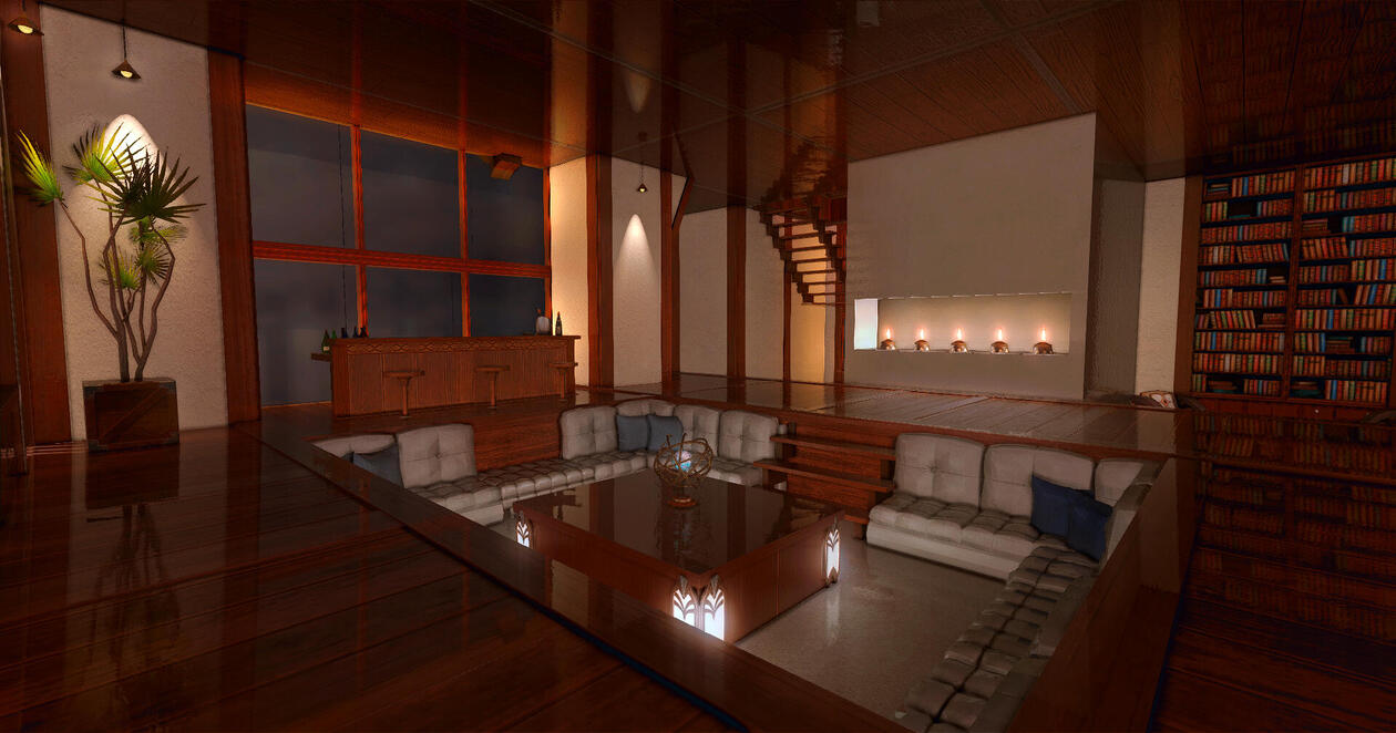 Moody modern mansion featuring a sunken-in living room, two bedrooms, and an upstairs private club. Ample seating for you and any guests to enjoy.