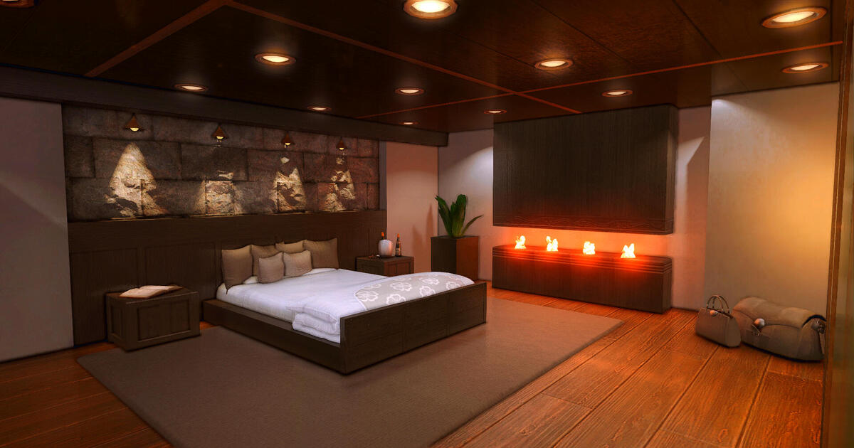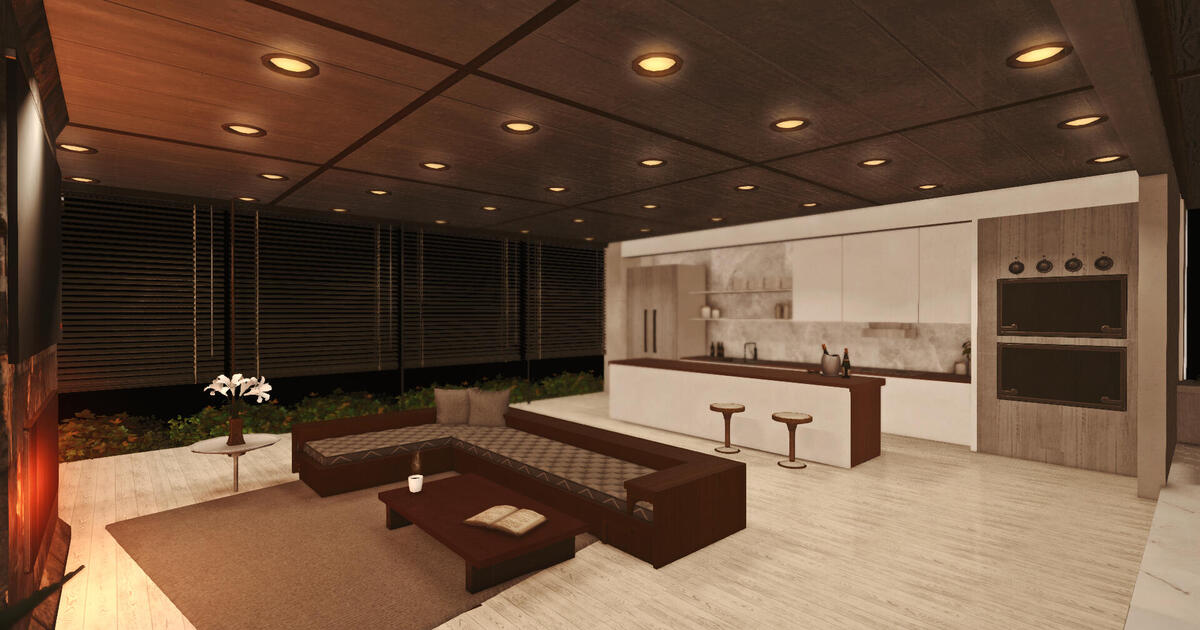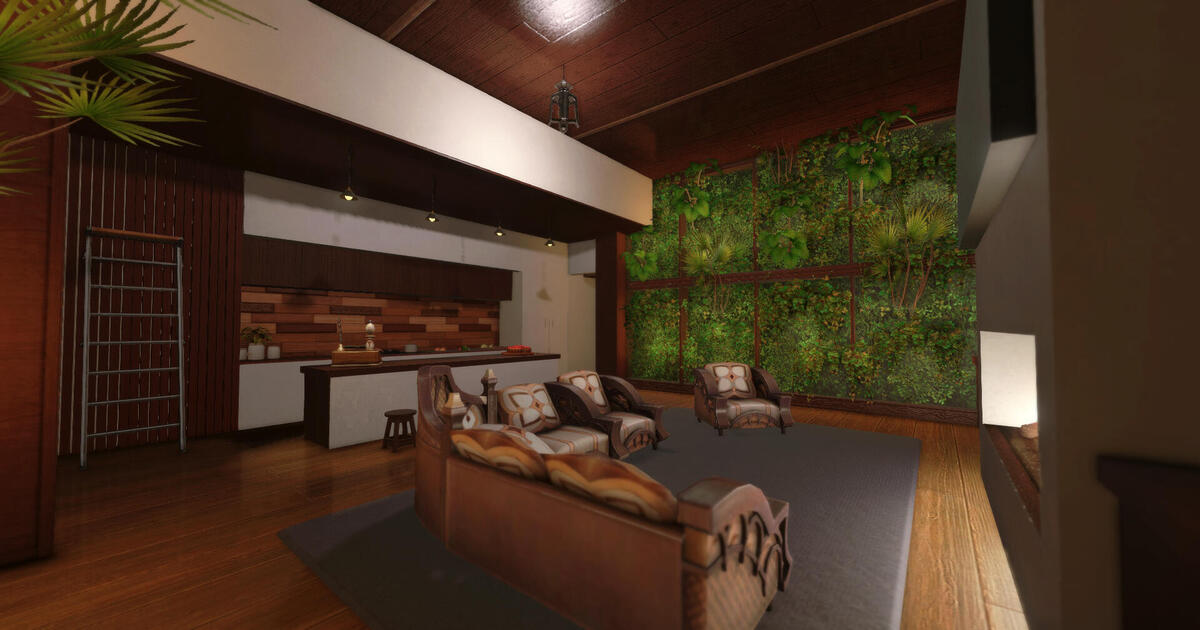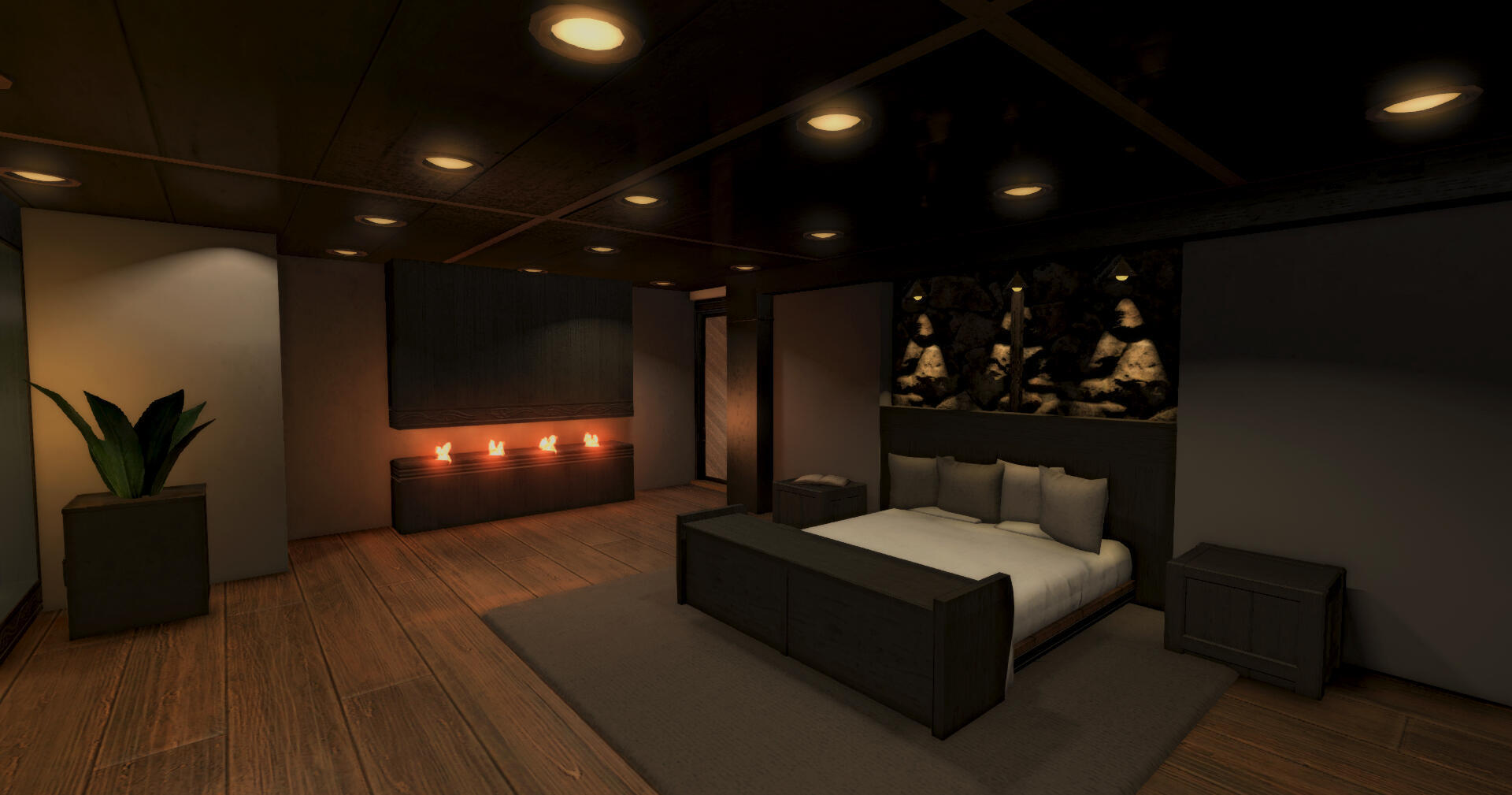 Moody modern mansion featuring a sunken-in living room, two bedrooms, and an upstairs private club. Ample seating for you and any guests to enjoy.